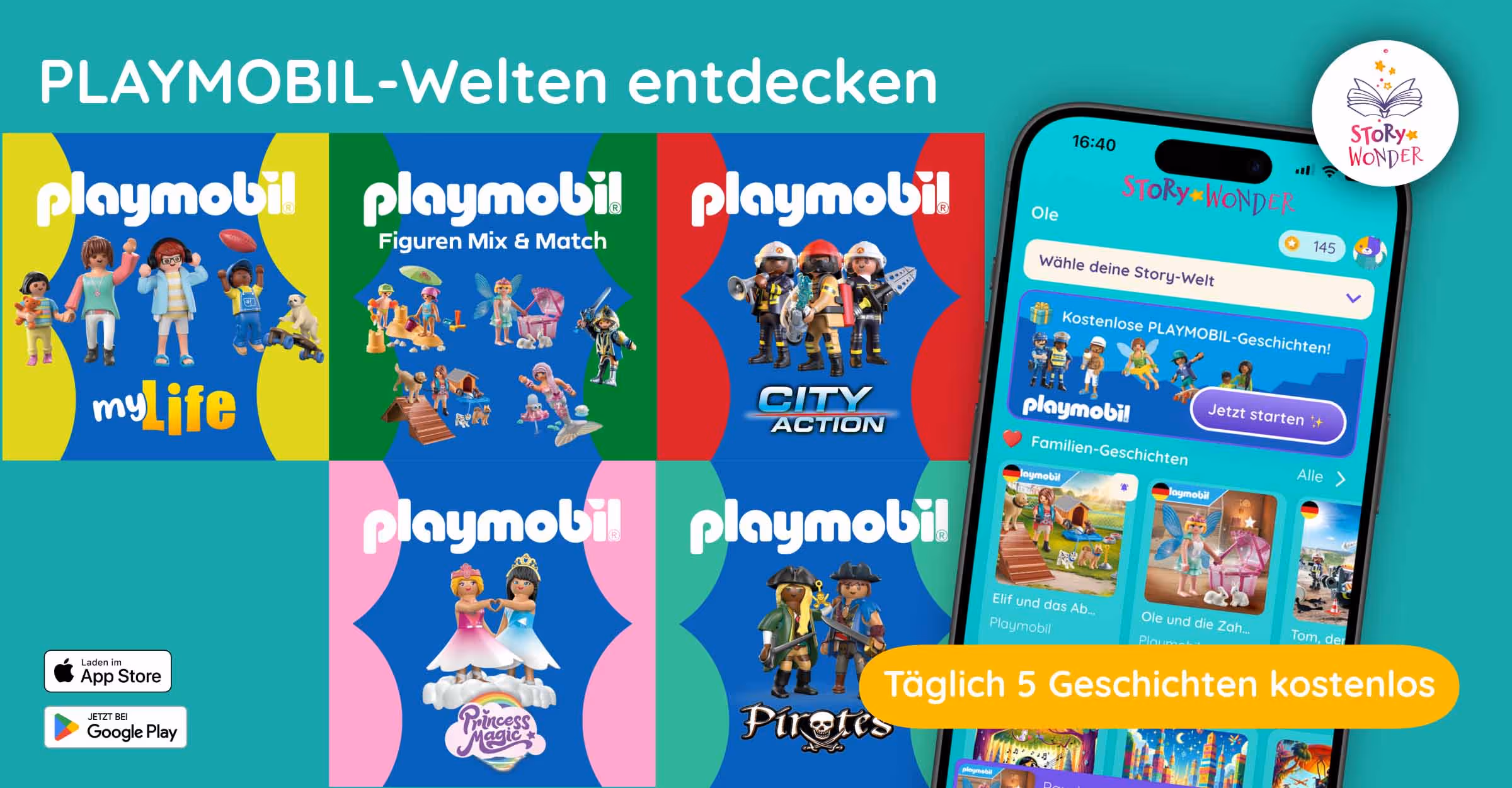 Mit unserer App StoryWonder und den beliebten PLAYMOBIL-Welten startet ein völlig neues Spielzeitalter. Unsere KI-Technologie verwandelt Figuren, Orte und Lieblingssets in lebendige, maßgeschneiderte Geschichten – mit deinem Kind als Held oder Heldin. Ob „Princess Magic“, „Pirates“ oder „CITY ACTION“: Die Abenteuer passen sich an das Alter, die Interessen, ja sogar an den Namen deines Kindes an. So wird Spielzeit zur Geschichtenzeit.